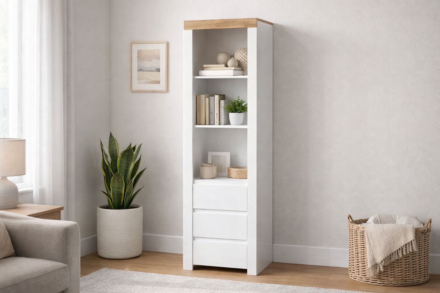 Tall Shelving Unit Slim Narrow Bookcase White Gloss Cabinet 3 Drawers Oak Scandi Living Room Storage – Holten