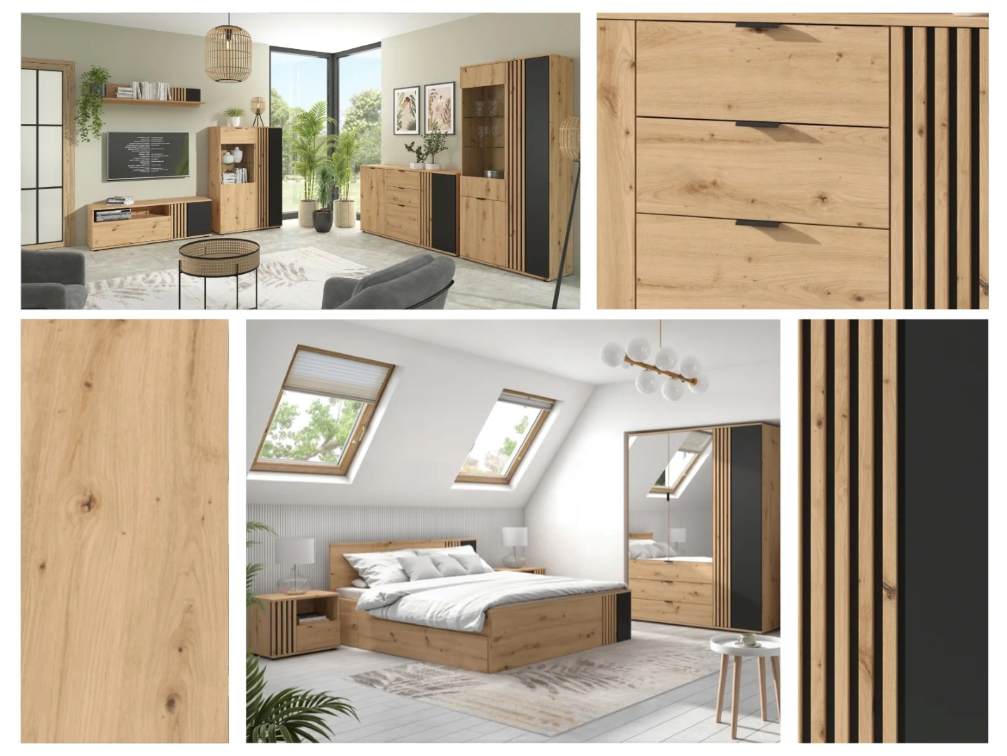The Vabres furniture range is a great choice for those who appreciate nature in their interiors, finished in a warm Artisan Oak effect finish, perfectly imitating the texture of wood. The furniture’s distinctive features are the MDF slats and black insert, with minimalist black handles to complete the look. The Vabres complements austere loft and industrial spaces, adding a visual warmth.