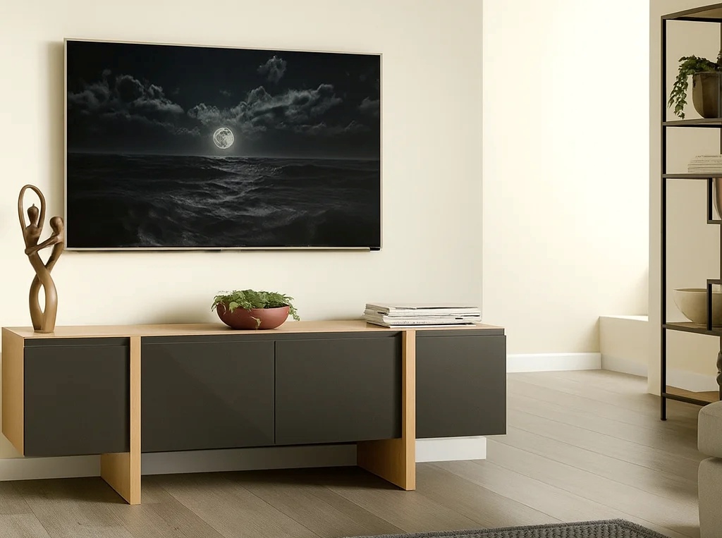 Designed with convenience in mind, the cabinet includes four handleless doors with soft-close pistons, offering generous hidden storage for consoles, accessories, and media equipment. Moreover, the rear wire vent ensures effortless cable organisation, helping you maintain a clean and clutter-free setup.