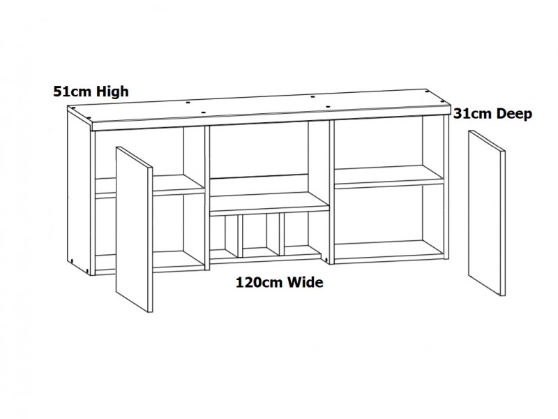 5 cm (H); 65 cm (D); 120 cm (W)1 x Malcolm – Wall-Mounted Cabinet with Shelves Size: 51 cm (H); 120 cm (W); 31 cm (D)1 x Malcolm – Tall Cabinet Shelf Unit Size: 205.
