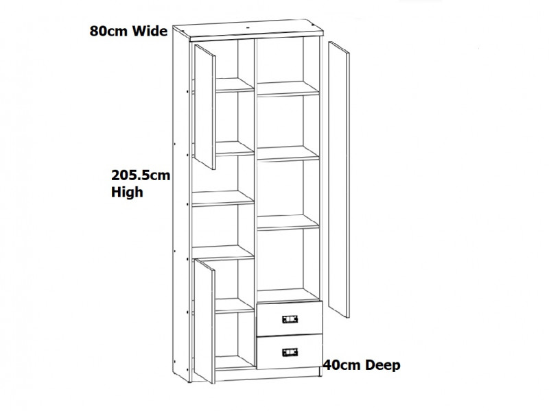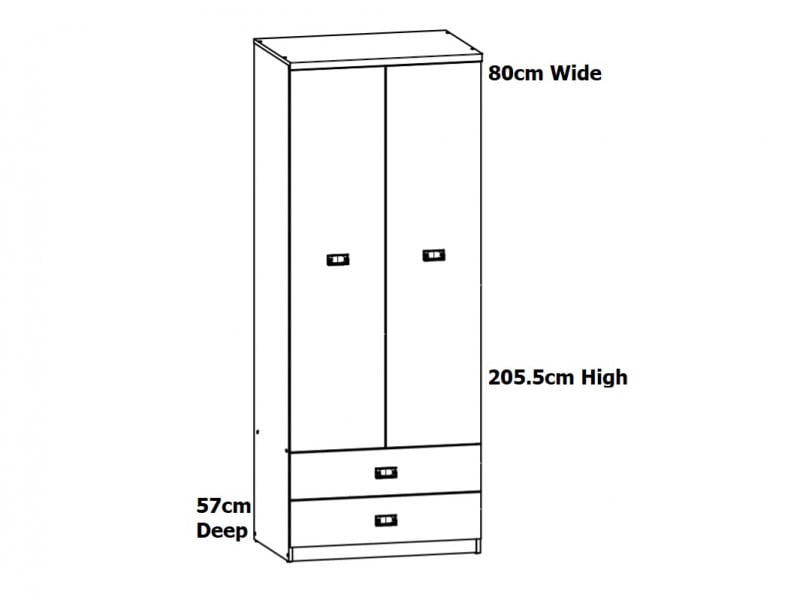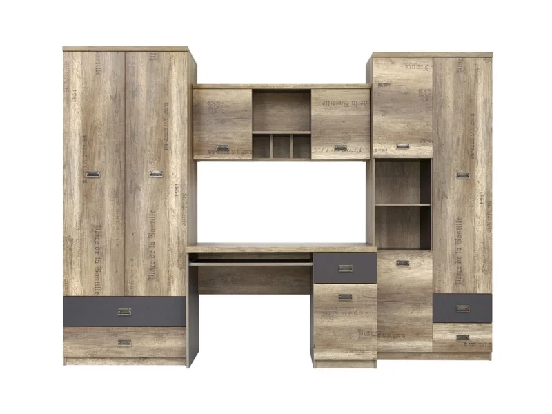 Features:Body made of laminate MDF board in oak canyon monument and grey wolframFront made of high quality laminate board in combination of oak canyon monument and grey wolfram with original 3D printingMetal handles in the antique nickel colourDrawers on the roller guidesThe four elements included in the set are:1 x Malcolm – Two Door Wardrobe Size: 205.